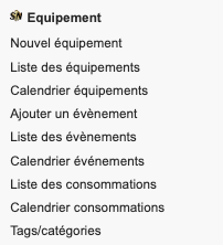 Menu principal Point d’entrée principal de la documentation du module Équipement, ce menu donne accès aux trois sections essentielles : Équipements, Événements et Consommations.