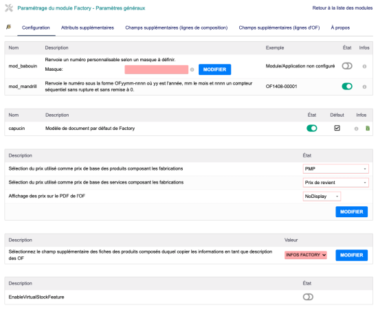Le module Factory permet la personnalisation du masque de numérotation des ordres de fabrication.