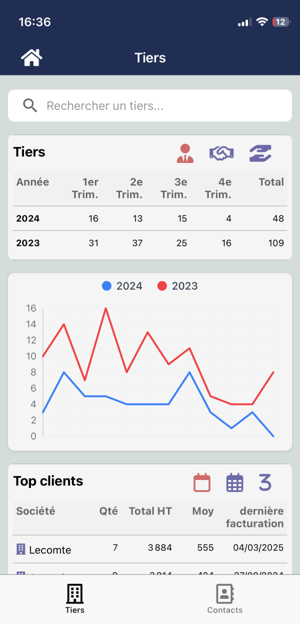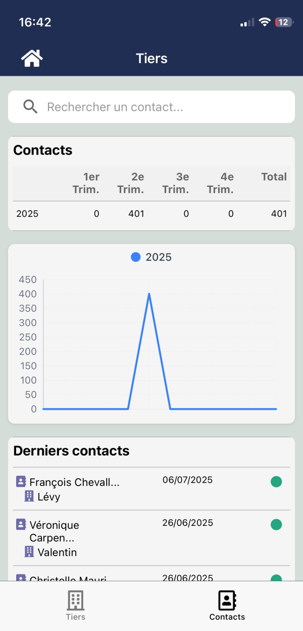 Dans l'onglet Tiers de Dolismart-app, vous trouverez différents onglet correspondant aux information présentes dans votre instance Dolibarr. Comme expliqué précédament il est possible de paramétré ce que vous voulez affiché dans l'onglet Tiers de l'appication.