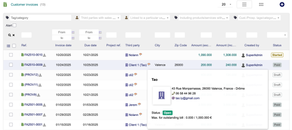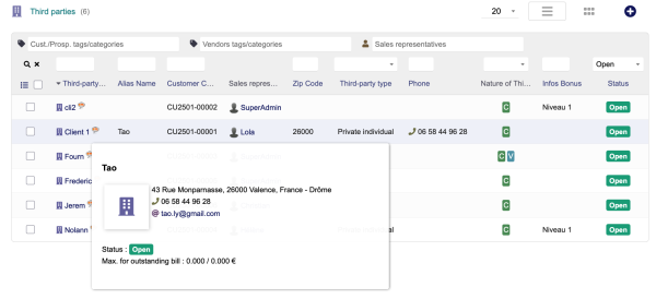 Once the display duration of the customTooltips is set, when you hover your cursor over the names or labels of third parties, contacts, members, products/services, and calendar events, you would see: