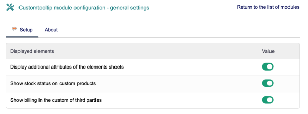 The table rows allow you to enable or disable the display, within customTooltips, of data from additional fields created in modules related to the source element of the customTooltips, stock levels for products, and outstanding invoices from third parties.