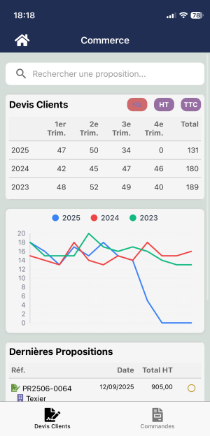 - Tableau des commandes par trimestre avec filtrage (Nb, Montant HT et TTC)