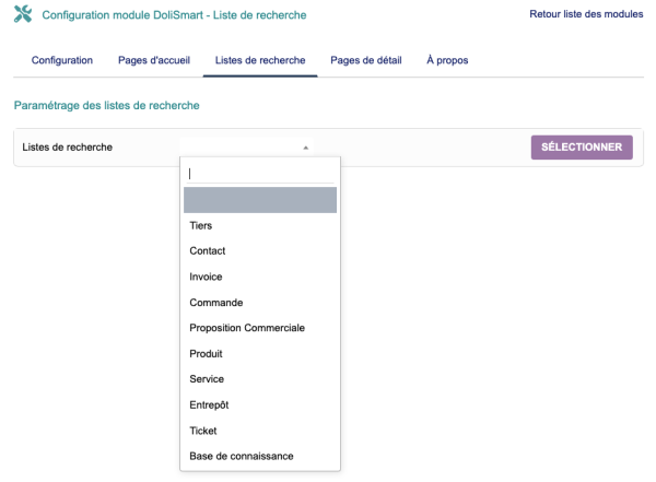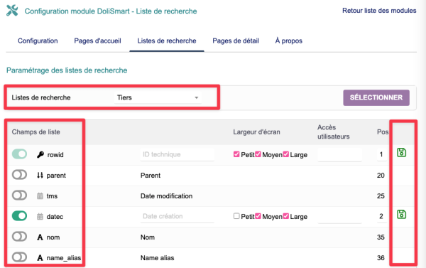 Il est possible de configurer les champs qui seront affiché lors de la recherche, à l'écran de l'application Dolismart en fonction de la page d'index choisi.