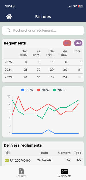 - Tableau des règlements par trimestre avec filtrage (Nb & Montant)