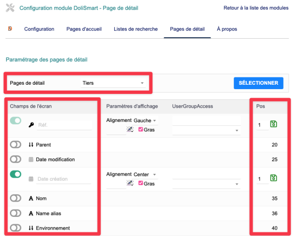 - Sélection des champs sur les écrans de détail et personnalisation de ceux-ci (changement de libellé, surlignage, mise en gras)