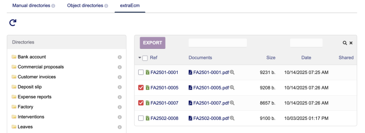 ExtraECM enhances native document management (EDM) by adding file selection and export to a ZIP file and document filtering based on creation date. |