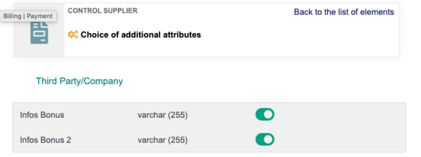 After pressing the additional attribute selection icon, a screen displays the fields already configured and allows you to add new ones.