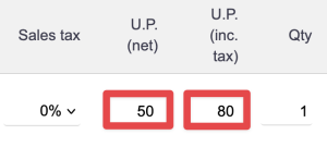If VAT = 0% and the Price excluding tax = €50, you can also enter a different amount in the Including tax field.