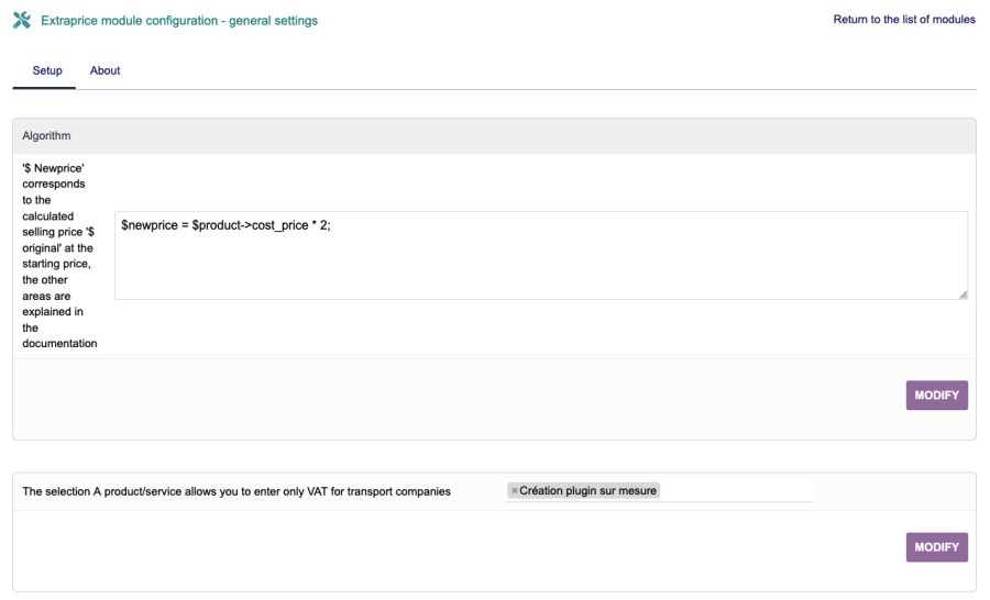 The configuration of the Extraprice module is done from the administration screen accessible from the list of modules.