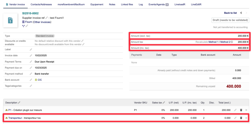 Lors de la création d’une facture fournisseur, vous pourrez désormais ajouter ce service « TVA » et lui attribuer sa valeur monétaire exacte dans le champ P.U. HT.