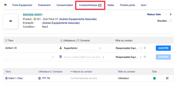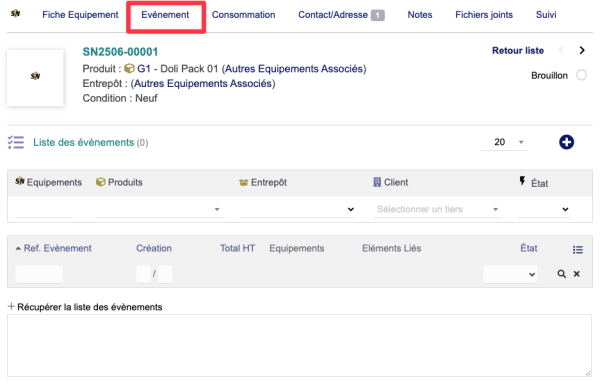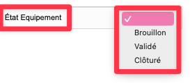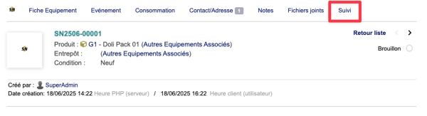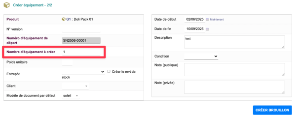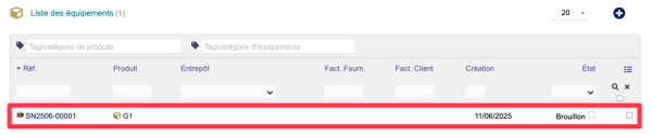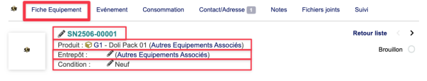 | Si l'on ne sélectionne pas d'entrepôt à la création de l'équipement, celui-ci reste à l'état brouillon car il n'est pas physiquement présent. |