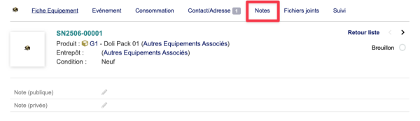 Permet d'ajouter des notes PUBLIQUE ou PRIVÉE en lien avec l'équipement. |