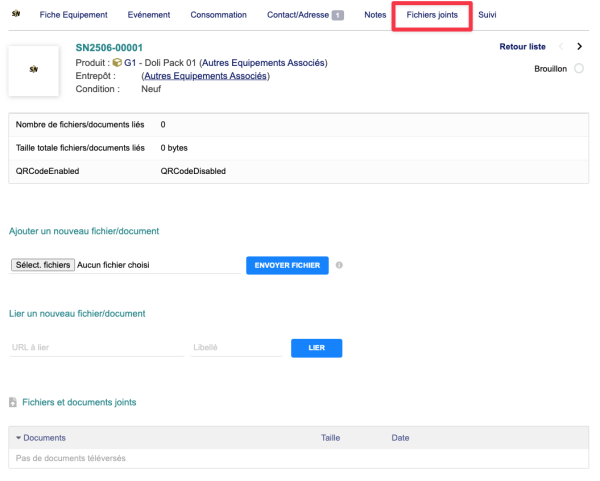 Vous pouvez associés des documents grâce à l'onglet "Fichier Joints" sur les équipements que vous aurez crées.