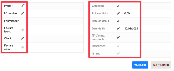 Projet, N°version, Fournisseur, Facture fourn, Client, Facture client, etc... Il es possible d'ajouter des champs supplémentaires depuis la configuration du module (dans l'onglet Attributs supplémentaires équipements). |