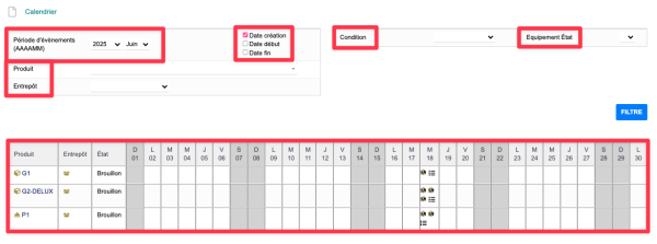 Si vous filtrer en fonction d'une produits ; vous n'apercevrait dans le calendrier que les équipements lier à ce même produits. |