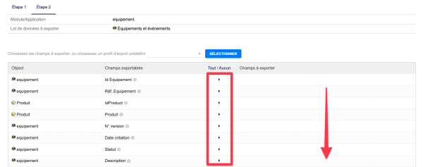 La fonctionnalité d'export permet le traitement des informations des équipements sous différents formats avec sélection de nombreux champs utiles.