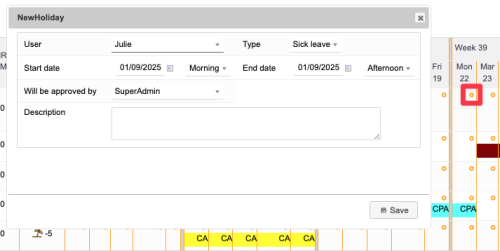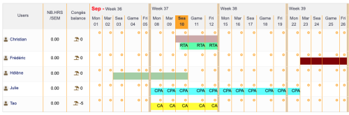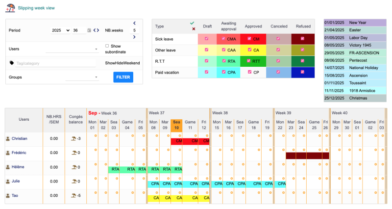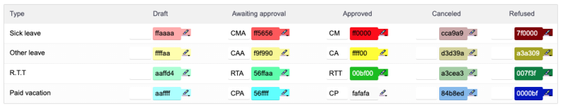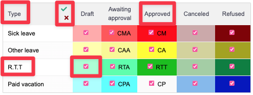 When a leave is present over a period, it is displayed with the color (and/or an abbreviation) defined according to its type and the defined status.