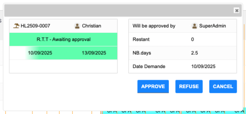 This last part allows you to view the details of the leave, to validate/approve/reject and cancel leave and naturally to create a leave request.
