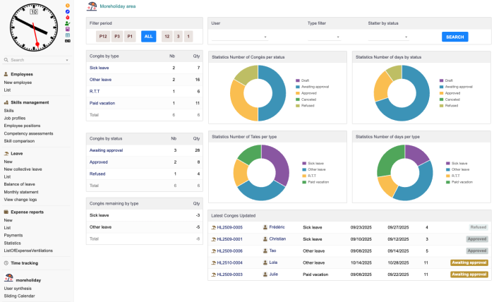 • A statistics page, presenting dashboards and graphs related to leave management.