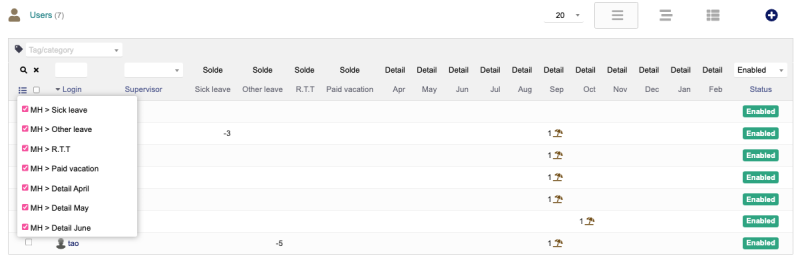 The second group of columns corresponds to the user's monthly leave for the month. It is possible to configure the selectable months in the module configuration (you can define the number of months preceding the current month and the number of months following). The value in the column corresponds to the number of leaves taken by the employee.
