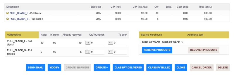 After the order is validated, it is possible to reserve the product quantities in the storage warehouse.