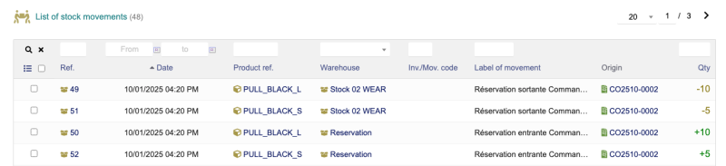 To clarify: the products are no longer listed in the main Dolibarr warehouse, but are now located in the dedicated warehouse for reservations.