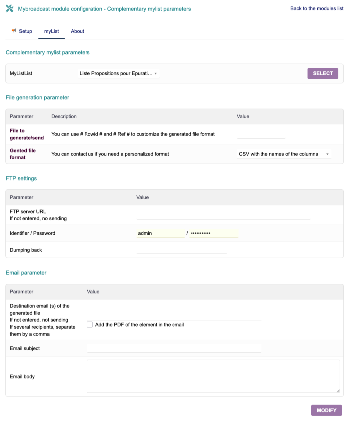 myBroadcast allows you to add a button to Dolibarr elements that generates a CSV file and then send it by email or FTP.