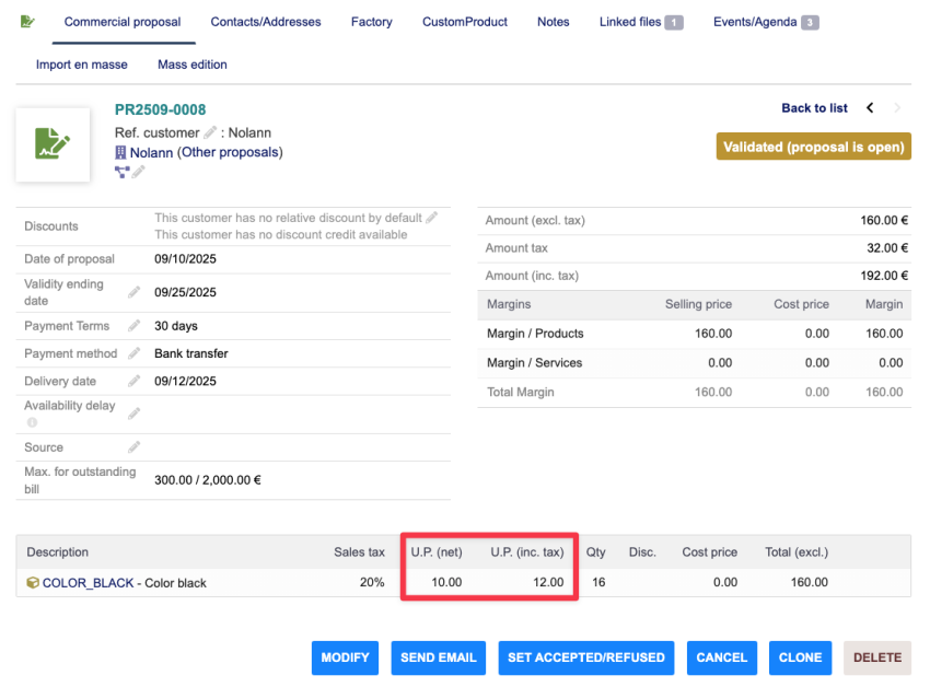 The module can be used for proposals, orders, and customer invoices.