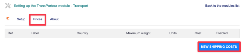 A new window will appear with the fields to be filled in to configure the New Shipping Costs: