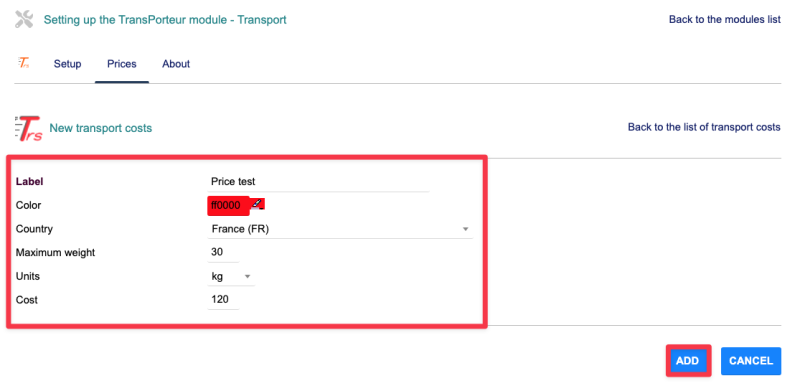 Once all fields are completed, click the "Add" button to save the new shipping cost.